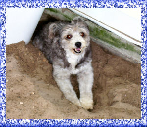 BENJI IN THE SANDBOX WE BUILT FOR THE DOGS |