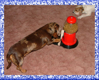 RUSTY ISN'T GOING TO LET MAX HAVE ALL THE FUN. HE IS LEARNING TO OPERATE THE GUMBALL MACHINE TOO, AS JENNIE LOOKS ON. |