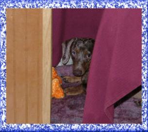 POOR MAX HAS TO HIDE SO JENNIE WON'T TAKE HIS STUFFED TOYS. |