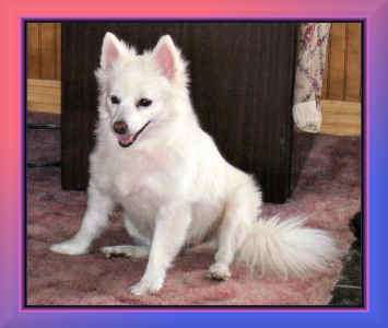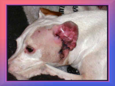 | HOLLY ALSO HAD A PROBLEM SINCE THE LAST PICTURE PAGE. IN JANUARY SHE DEVELOPED A SEVERE EAR INFECTION REQUIRING SURGERY. HER EAR CANAL ACTUALLY HAD TO BE RELOCATED. HER "NORMAL" EAR CANAL HAD TO BE SEWN SHUT AND A NEW EAR CANAL OPENED ON THE SIDE OF HER HEAD. THE DARK SPOT ON HER CHEEK IS ACTUALLY HER NEW EAR. |