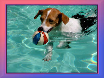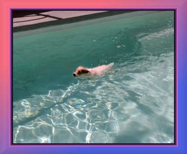 | ON THE LEFT, BAILEY ACCIDENTLY DROPPED HER BALL IN THE POOL. RUSTY IMMEDIATELY WENT IN TO RESCUE IT. ON THE RIGHT, WE HAVE A NEW SWIMMER. JENNIE IS BEGINNING TO ENJOY THE POOL AS MUCH AS RUSTY DOES. |