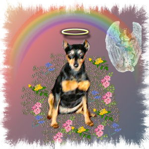 | SERENA'S STORY Serena arrived totally unexpected in January 1996, given to John and I as a birthday present by our daughter, Shelly. I had made a one-time comment to Shelly about missing our Doberman, Sabrina, and that we had looked at Miniature Pinschers because we weren't ready for another Doberman. Shelly asked us to meet her for dinner one night to celebrate our January birthdays. When we arrived at the appointed meeting place, we discovered that she was going to be late. As it turned out, she had gone to the airport to pick up the puppy who was being flown in from a breeder in South Dakota. There was a blizzard occurring at the time in the North, and the plane was delayed in Chicago. When it finally arrived in Orlando, the puppy was inadvertently delivered to the passenger terminal instead of the cargo terminal where Shelly was told to pick her up. Poor little Serena must have been very confused going around in circles on the luggage conveyor belt. The mistake was eventually uncovered, and Serena and Shelly were finally united. Finally, Shelly met us. We looked up just as this little, tiny, black flash ran by. The puppy was so excited to finally be released from the crate that had held her prisoner for over 12 hours. She would run a few feet and then jump up into the air, and then run a few more feet and do the same thing. John nicknamed her Grasshopper, and this nickname has been hers alone for the eight years she has been with us. Serena possesses all the traits of a typical Miniature Pinscher. She is very active and playful even at almost 8 ½ years old. I truly can't imagine she will ever slow down. She does possess one very annoying behavior. In her eyes, everything that is mine is really hers. I have definitely learned not to leave my things within her reach. She has never tried to destroy anything, but rather collects everything she can and hides her collection under the bed. By the back door I have 3 old pairs of shoes I keep there to use when I go into the yard. One by one, Serena will bring the shoes into the house, walk right past me with it in her mouth, and take it under the bed. She will repeat this until all the shoes are under the bed. Then she will look for another item belonging to me. If my purse or car keys are within her reach, she will take those. She will pull my clothes out of the laundry basket. What is strange is that she will not touch John's things even if everything is in one pile. She will sort through things until she finds everything belonging to me. At least I know where to start looking for missing items. My little thief certainly brings a lot of joy into my life and I treasure every moment with her. |